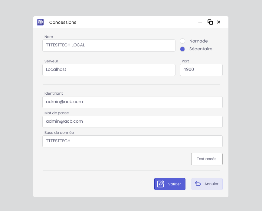 Clique sur Test accès, permet de vérifier que la connexion est autorisé, ce qui signifie que toutes les informations renseignés sont correct.
