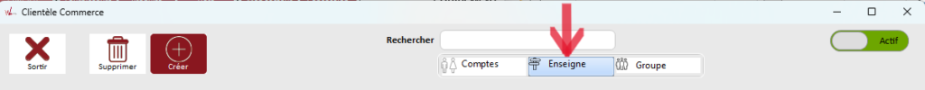 Puis cliquez sur le bouton « Créer » dans la fenêtre « Clientèle Commerce » permet d’ajouter un nouveau client, une enseigne ou un groupe. Lorsqu’un utilisateur clique sur ce bouton, une nouvelle fenêtre « Compte » s’ouvre en mode « Création » en fonction du type de clientèle sélectionné.